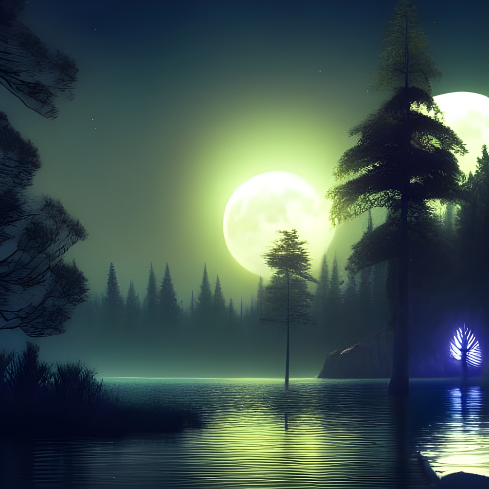 A n extremely detailed painting of a Moon Nightscape with shadowy trees and a beautiful lake in the background.